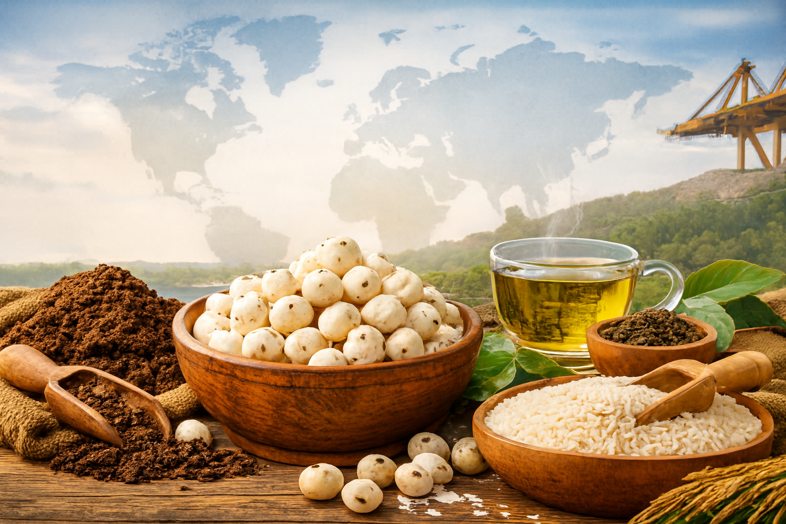 We export premium agricultural products including makhana, rice, moringa, tea, coffee, and